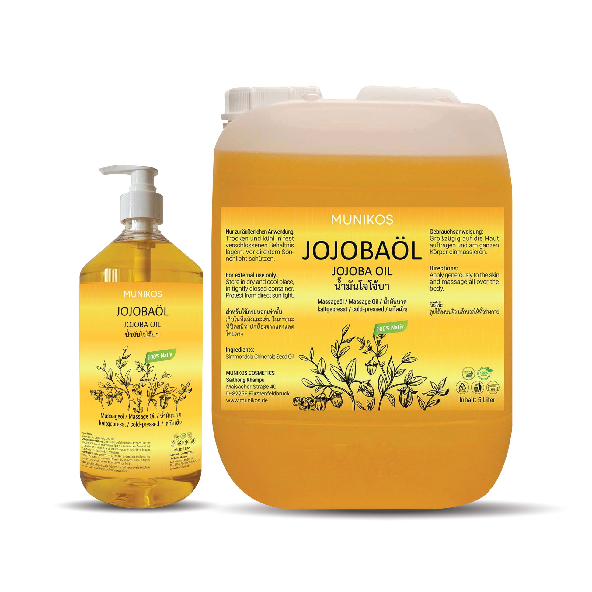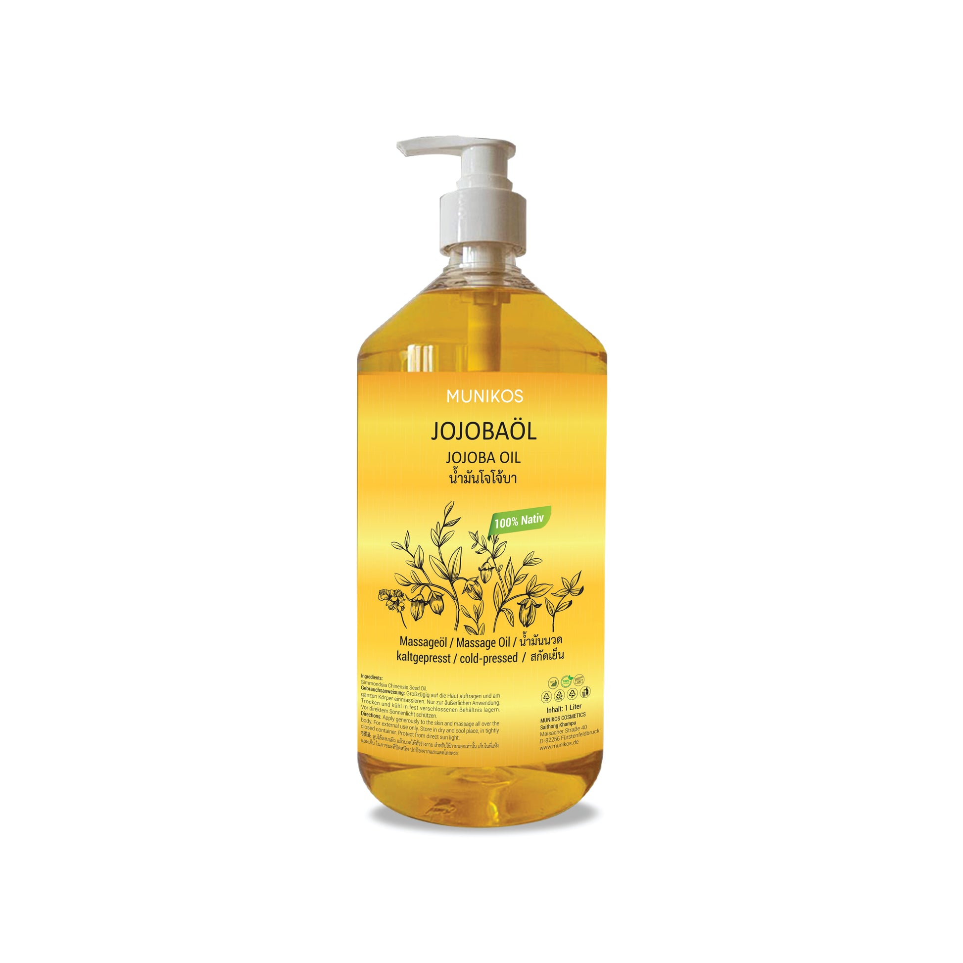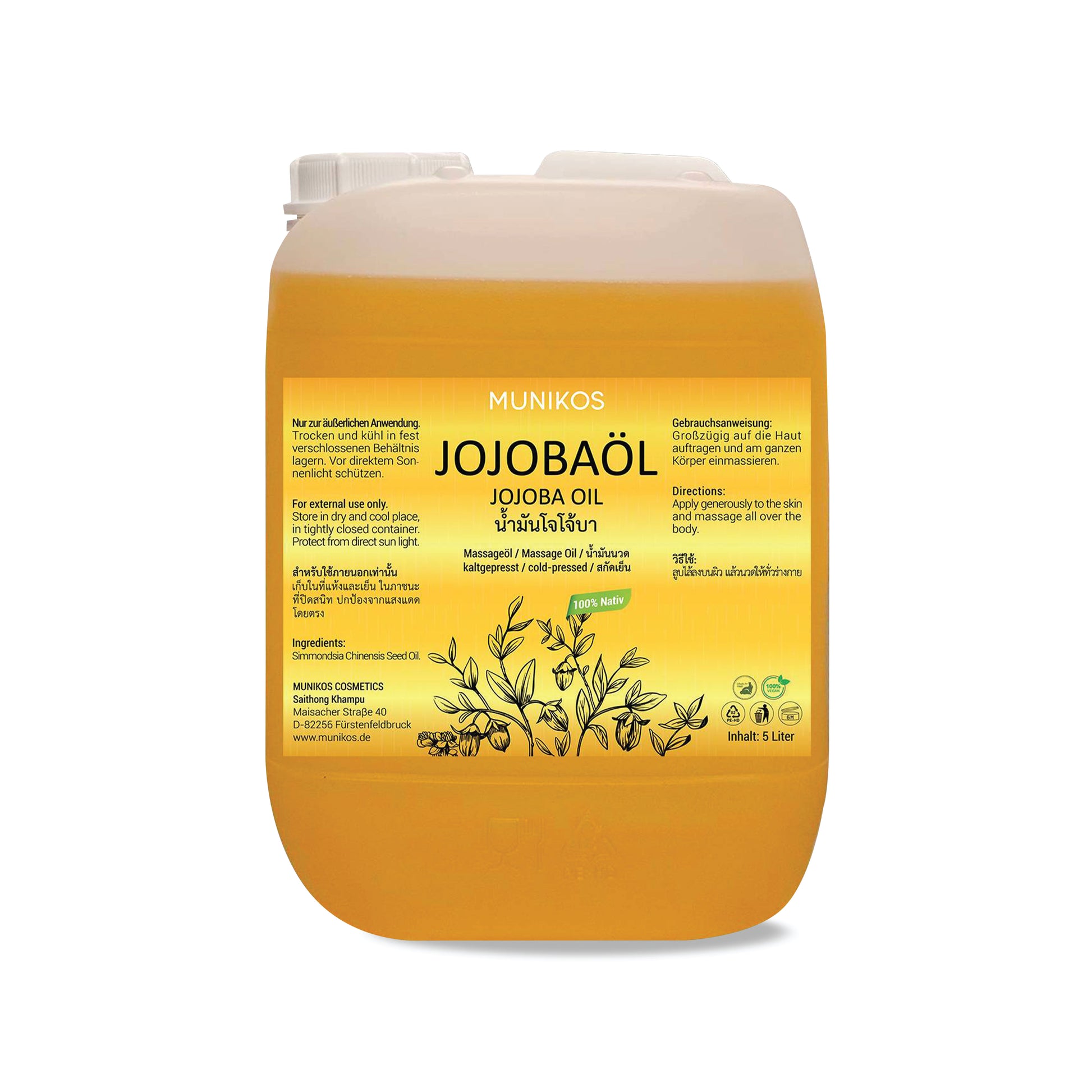 MUNIKOS JOJOBAÖL kaltgepresst wird direkt aus dem Kaltaustrieb der Jojobasamen (Simmondsia Chinensis) ohne jegliche Modifikation gewonnen. Bei dieser Methode können fast alle natürlichen Zusammensetzungen und Eigenschaften beibehalten werden. Das Öl hat eine hellgoldene oder hellgelbe Farbe mit einem angenehmen, leicht nussigen Aroma.